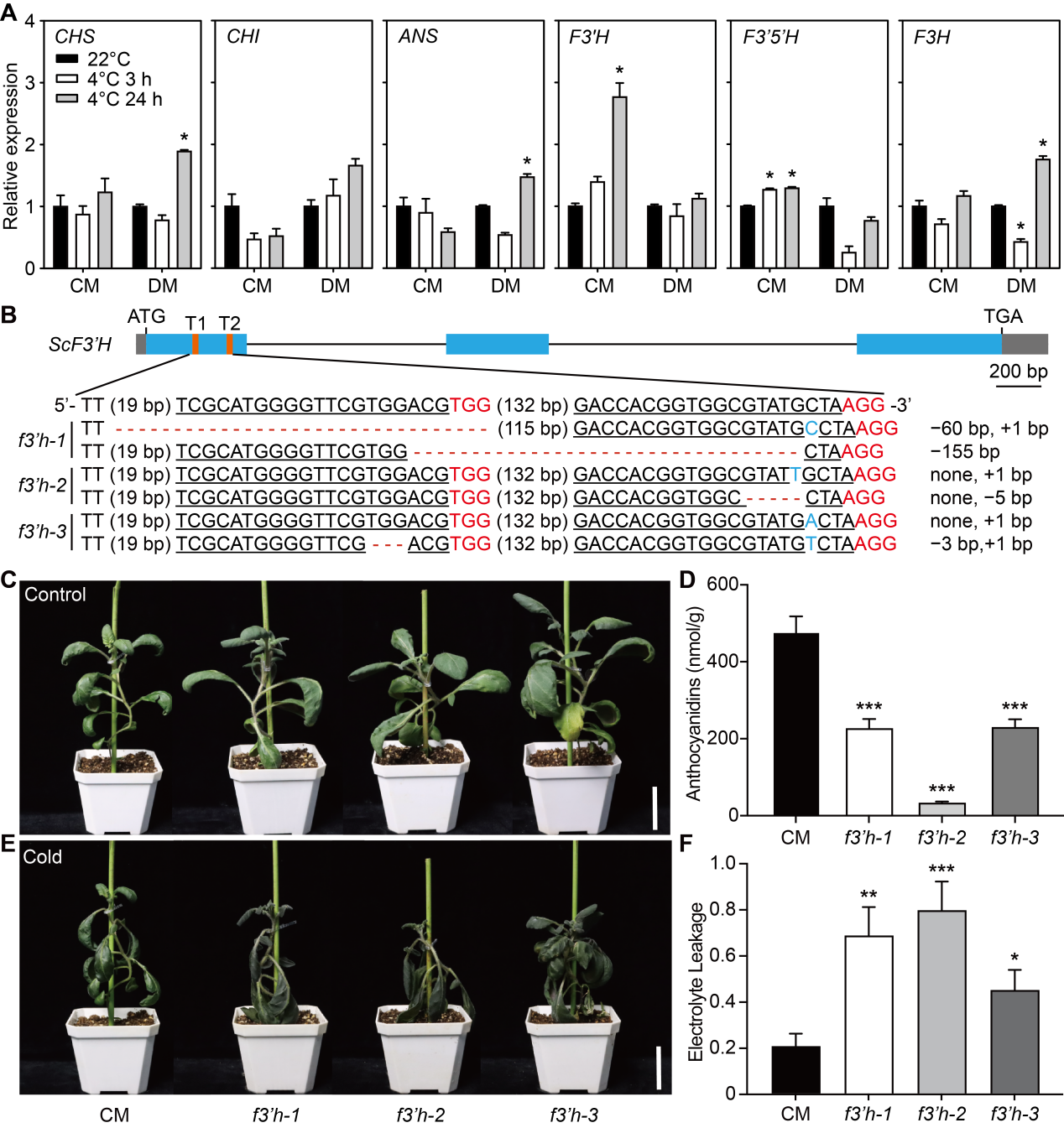 低温诱导耐寒野生马铃薯S. commersoniiScF3’H的表达。通过CRISPR/Cas9基因编辑技术创制了ScF3’H功能缺失突变体,f3’h突变体的花青素含量显著低于CM,且比CM对低温胁迫更加敏感,这些结果表明ScF3’H正调控CM的低温耐受性(图1)。