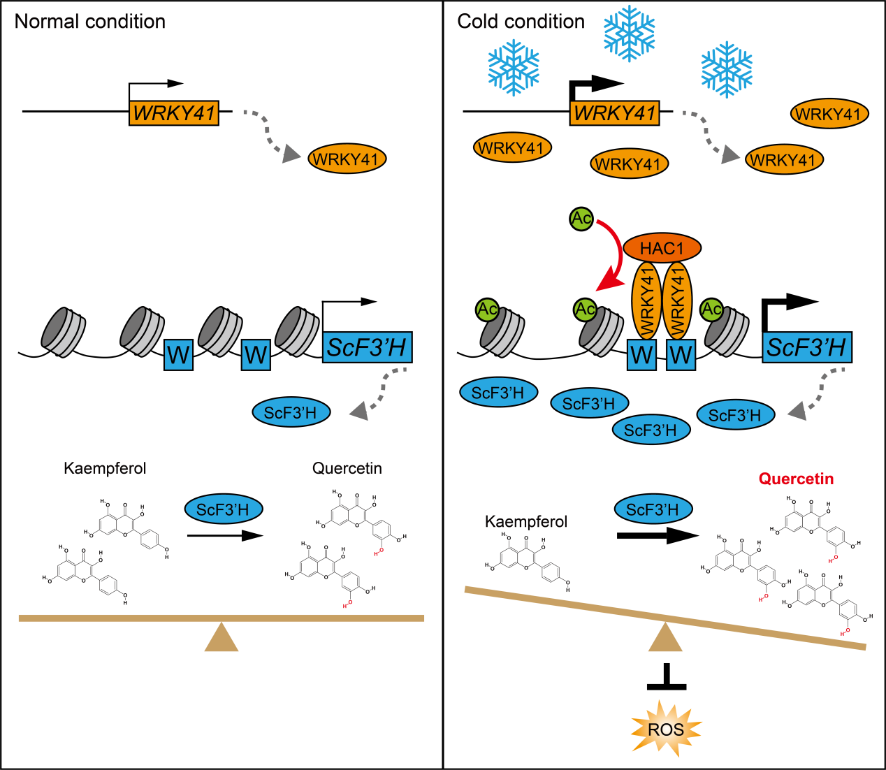 图3 调控模型:ScWRKY41-HAC1复合物激活ScF3'H表达影响黄酮代谢以应对低温胁迫