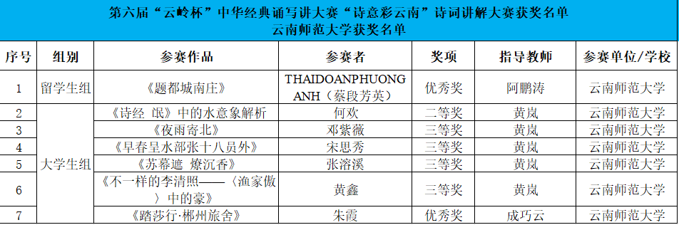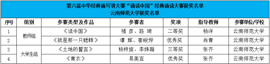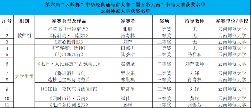 在第六届中华经典诵写讲大赛云南省选拔赛——由云南省语委、教育厅主办的第六届“云岭杯”中华经典诵写讲大赛中,我校共有28件作品获奖。在“书香彩云南”经典诵读大赛中,获大学生组一等奖2项、二等奖4项,留学生组二等奖1项、优秀奖1项,教师组一等奖2项;在“墨香彩云南”书写大赛中,获大学生组一等奖1项、二等奖3项、三等奖4项,教师组一等奖1项、二等奖1项、三等奖1项;在“诗意彩云南”诗词讲解大赛中,获大学生组二等奖1项、三等奖4项、优秀奖1项,留学生组优秀奖1项;共获“优秀指导教师奖”4项。
