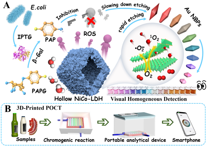 陈璐为避免在分析体系中使用不稳定的双氧水,致力将双金属和缺陷结构引入纳米酶中,从而高效调控类氧化物模拟酶的活性,用于多色生物传感的研制。由此思路,借助Kirkendall效应成功制备出具有双金属、中空结构、分层贻贝状阵列纳米片、缺陷结构的NiCo-层状双氢氧化物(NiCo-layered double hydroxide nanosheets, NiCo-LDH)。利用NiCo-LDH高效的氧化物模拟酶活性,将分析体系中的溶解氧催化转化成活性氧片段(Reactive Oxygen Species, ROS):单线态氧和超氧阴离子,可对具有局域表面等离子特性的金纳米双锥(Au NBPs)产生腐蚀,形成多色的可视化效应。另外,β-半乳糖苷酶(β-galactosidase, β-Gal)作为大肠杆菌(Escherichia coli, E. coli)特征标志物,可与底物对氨基苯基-β-D-吡喃半乳糖苷(p-aminophenyl-β-D-galactopyranoside, PAPG)反应生成对氨基苯酚(p-aminophenol, PAP),PAP作为还原性试剂可消耗NiCo-LDH分析体系中产生的ROS,以至于减缓并抑制Au NBPs的腐蚀,最终不仅实现了对β-Gal的可视化检测,还实现了对E. coli的可视化检测。为了进一步实现便捷式的检测效果,研究团队结合3D打印技术,打印了便携式检测盒,结合手机检测技术,通过RGB值实现对β-Gal介导的E. coli便携式检测。研究不仅阐明了NiCo-LDHs作为高效氧化酶样模拟物的构效关系,还为纳米酶的合理设计铺平了道路,为建立便携式视觉生物传感平台用于β-Gal活性和病原菌检测奠定了基础。