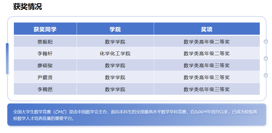 据悉,全国大学生数学竞赛由中国数学会主办,竞赛是为了激励大学生学习数学的兴趣,培养分析问题、解决问题的能力,提升我国高等学校人才培养质量,促进高等学校数学课程建设,并为青年学子搭建一个展示数学思维能力和学习成果的平台。