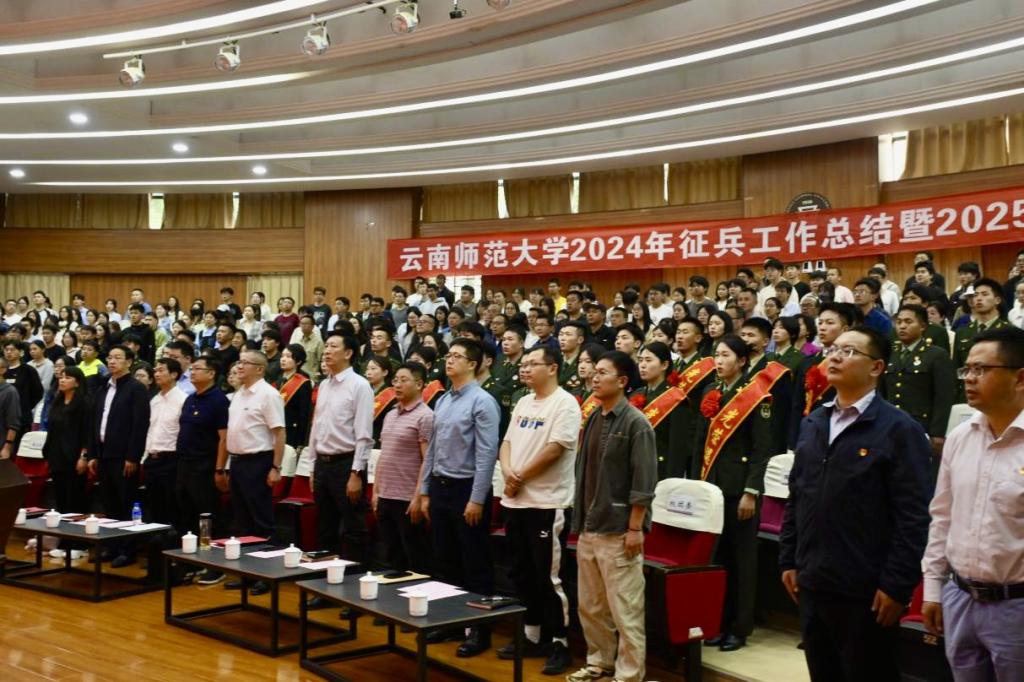 为总结年度征兵工作成效,激励青年学子投身国防事业,高质量完成2025年度征兵工作,4月28日下午,我校在呈贡主校区汇学楼报告厅举行2024年征兵工作总结暨2025年征兵动员会。校党委书记张祖武,党委副书记和雪莲,副校长甘健侯、陈正权,学校征兵工作领导小组成员单位主要负责人,各学院(学部)党委书记、副书记、辅导员,全体退伍复学学生及各学院(学部)学生代表参加活动。