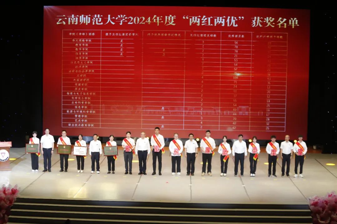 2025年共青团表彰大会在庄严的国歌声中拉开序幕。附属小学少先队员真挚献词致敬青年榜样。表彰大会总结了过去一年共青团组织在思想引领、实践育人等方面取得的显著成绩,对荣获团中央、团省委表彰的先进集体和个人代表、2024年度“两红两优”获奖集体和个人代表以及2024年度大学生“自强之星”“第二课堂活动先进个人”获奖代表进行表彰。