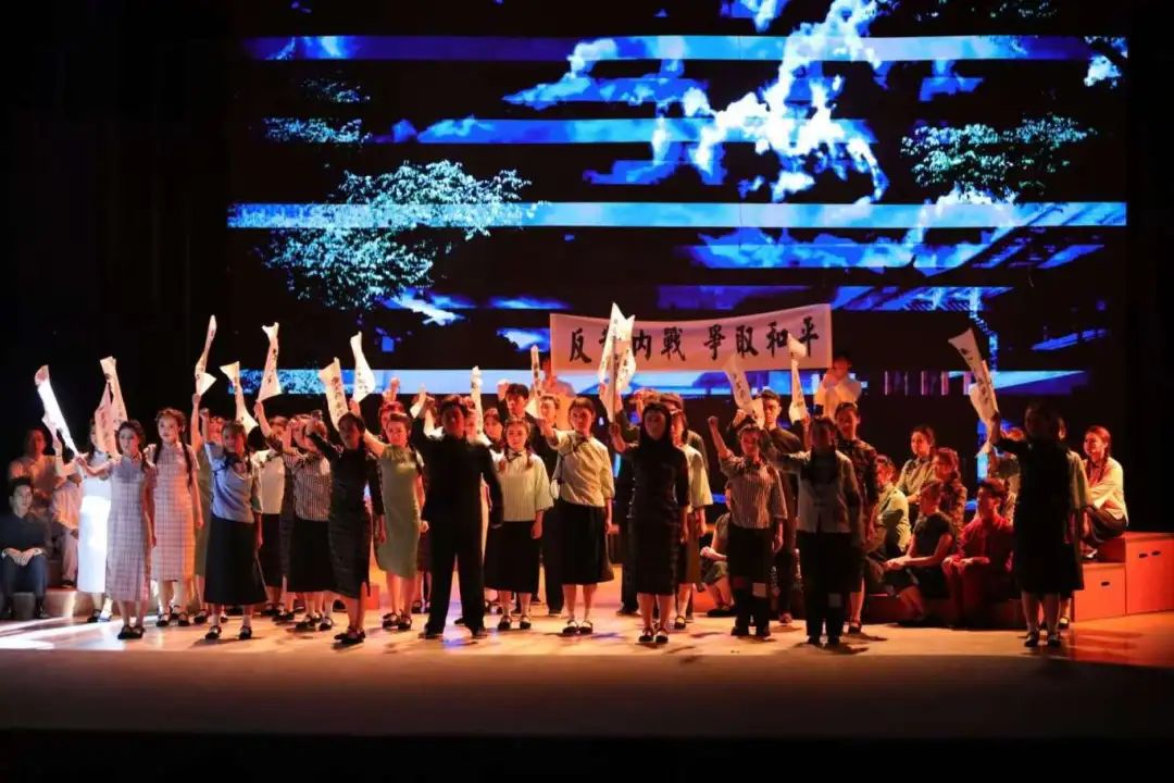 在艺术表现形式上,该剧突破传统舞台局限,打造出“可听的戏剧”。通过密集枪声、空袭警报与集体朗诵的巧妙交织,构建起沉浸式的历史场域,给观众身临其境的体验;动态投影技术同步呈现联大教室、硝烟街景、昆明城郊等场景,实现虚实结合,生动还原历史时空;闻一多先生由2021级播音与主持艺术专业毕业生黄祥宁饰演,以“00后”青年的视角与历史对话、与信仰对话。他感慨道:“饰演闻一多的过程,让我真正理解了何为‘文人的脊梁’,这是大学时代最深刻的一堂思政课。”