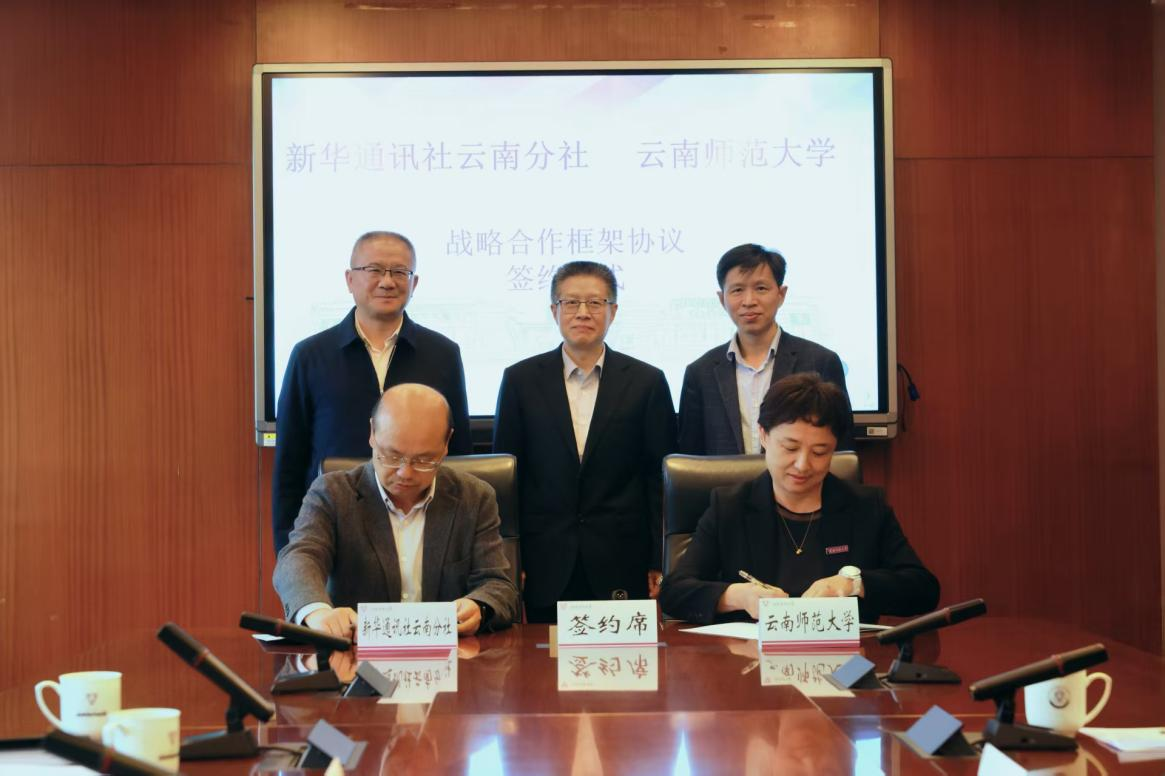 在与会人员的共同见证下,和雪莲与王江签署了《新华通讯社云南分社 云南师范大学 战略合作框架协议》。