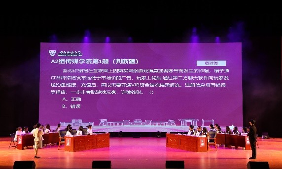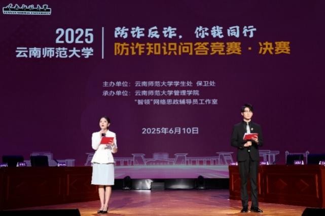 在竞赛答题环节,入围决赛的法学与社会学学院、文学院、传媒学院、历史学院、数学学院、地理学部6支参赛队两两答题pk。竞赛题目涵盖国家反诈中心《防范电信网络诈骗宣传手册》、呈贡区公安局反诈典型案例、网络安全法、反电信网络诈骗法等内容,全面考察参赛队伍的防诈知识水平。各支参赛队伍精神饱满,现场气氛热烈。互动问答环节中,现场观众踊跃参与竞答,反诈知识深入人心。