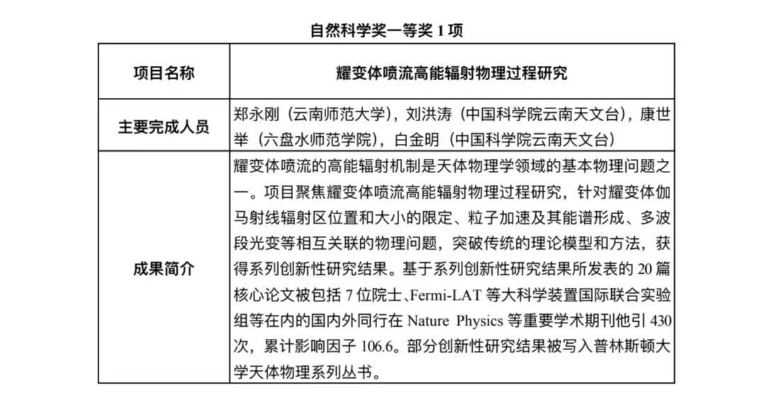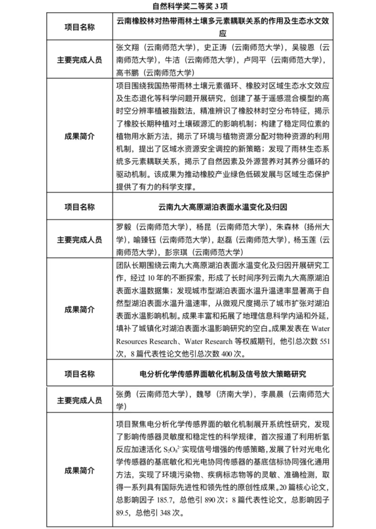 由云南师范大学牵头形成的6项成果获2024年度云南省科学技术奖,其中自然科学奖一等奖、科技进步奖一等奖各1项,自然科学二等奖3项、三等奖1项。云南师范大学参与形成的3项成果分获科技进步奖一等奖和二等奖各1项(排名第4和第5),自然科学奖二等奖1项(排名第3)。
