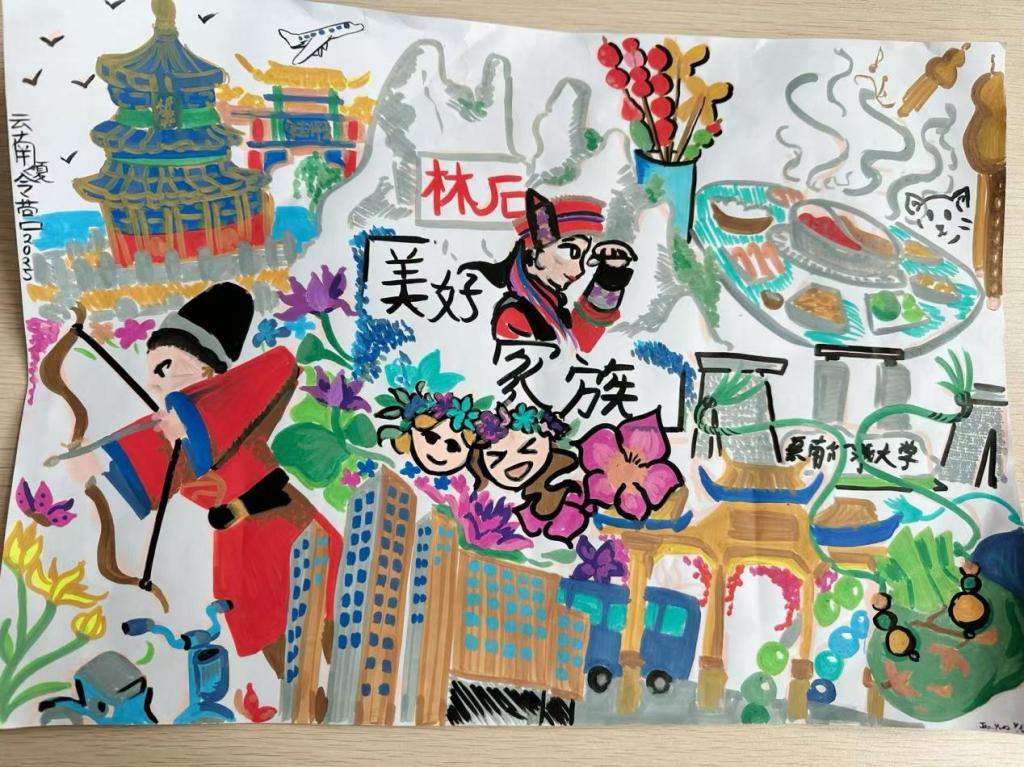营员Bennit Michahelles和SimonMichahelles分享他们最喜欢中国传统建筑,通过老师深入浅出的教学,他们了解了中国建筑的博大精深。Benjamin Beyer、Nikolas Beyer、Lisa Kühn、Zara Wills-Gavach表示最喜欢才艺课,特别是射箭、舞龙、舞狮,充分感受到中华传统文化的魅力。Ann Gugel、Lira Restelica觉得中国竹编、扎染和锡箔画十分有意义,因为这些课都需要耐心才能做出精美的作品,需要培养恒心和毅力。同学们为本次夏令营取了一个名字——“美好家族”,并手绘了一张海报表达了对夏令营满满的热爱。