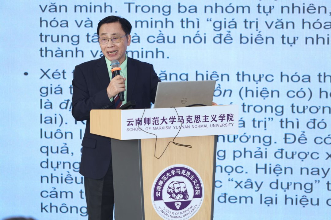 胡志明市雄王大学校长顾问、前越共中央理论委员会委员、前胡志明市国立大学科学与培训委员会主席陈玉添做了题为《比较视域下的越南社会主义文明价值体系建设》的报告,从文明价值维度分享了研究成果。