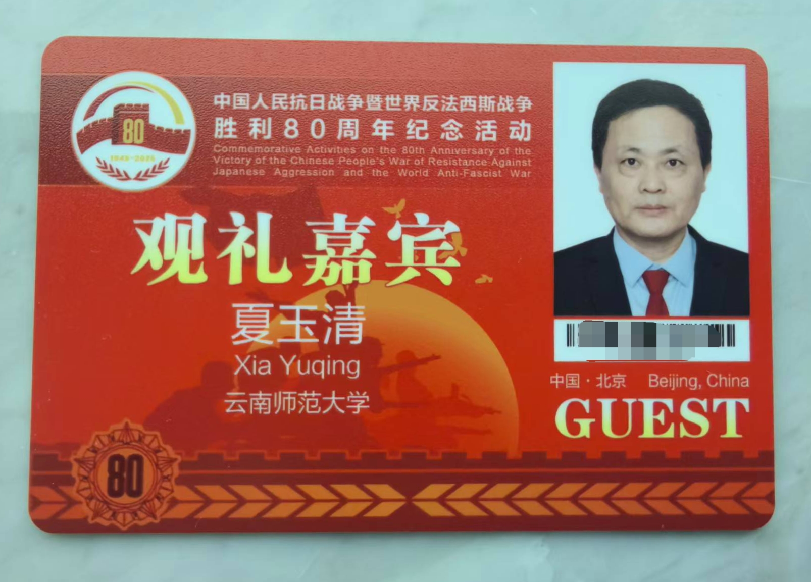 9月3日,纪念中国人民抗日战争暨世界反法西斯战争胜利80周年大会在京隆重举行。我校云南华文学院(国际中文教育学院)夏玉清教授作为华侨华人抗战研究领域学者代表,受中央统战部邀请现场观礼九三阅兵。