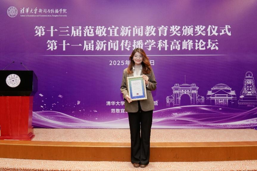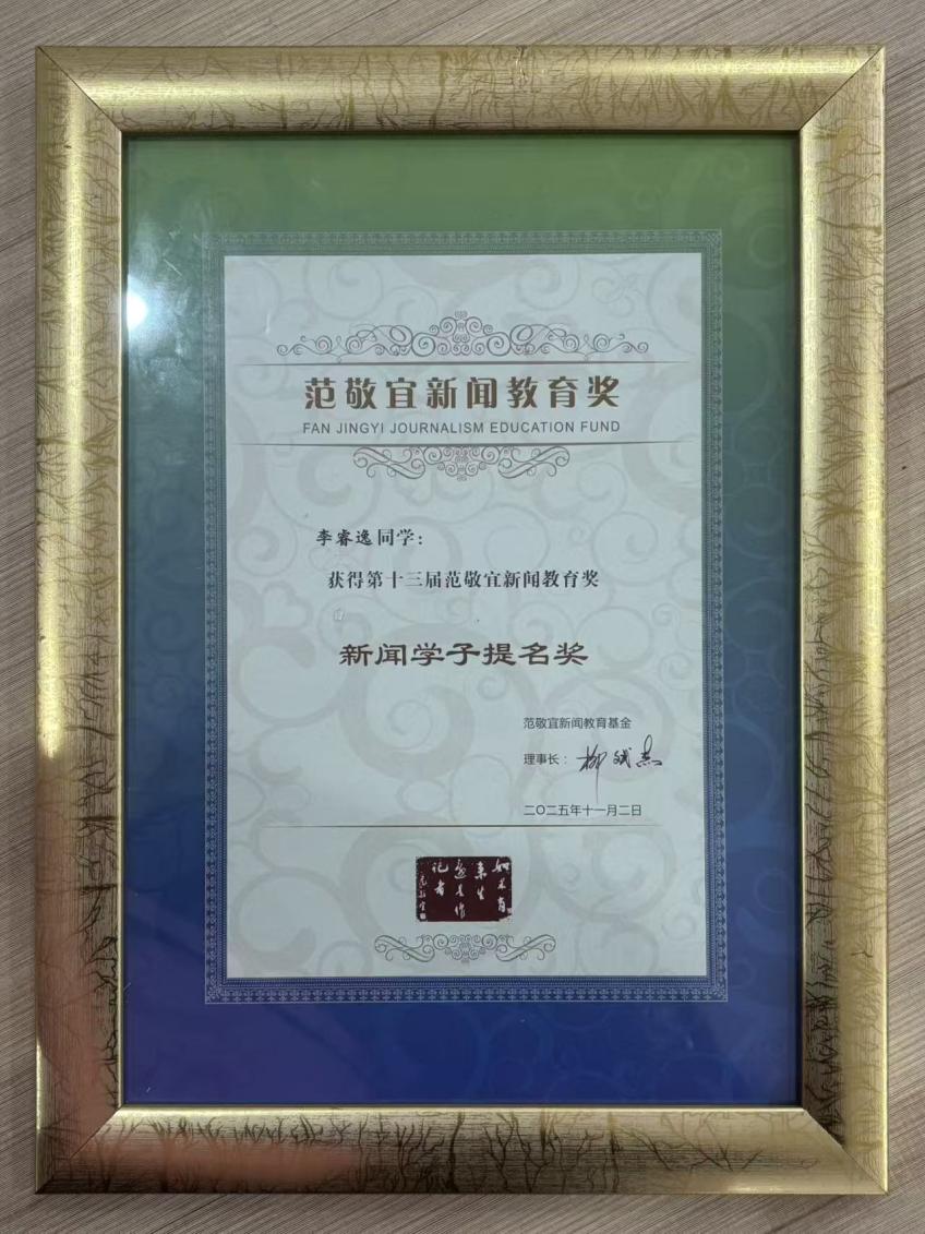11月2日,第十三届范敬宜新闻教育奖颁奖典礼暨第十一届新闻传播学科高峰论坛在清华大学举行。十二届全国人大教科文卫委员会主任委员、原国家新闻出版总署署长柳斌杰,人民日报社编委委员、海外版总编辑陈贽,清华大学党委常务副书记向波涛,中国记协党组成员、书记处书记殷陆君,中国外文局副局长于运全等嘉宾出席颁奖典礼。我校传媒学院新闻学2023级本科生李睿逸荣获新闻学子提名奖,系云南师范大学首位在读期间获得范敬宜新闻教育奖的学生。