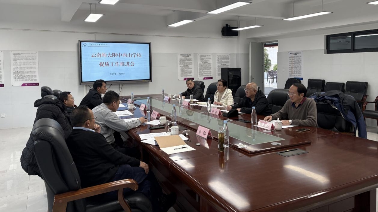 11月18日,云师大附属中学西山学校召开提质工作推进会,大会由云南师范大学副校长孟庆红主持。基教集团党委书记曾东风、基教集团主任王玉光、副主任孙祥,师大附中党委书记王英、校长孙毅、副校长付加国、西山学校执行校长张春和参加会议。