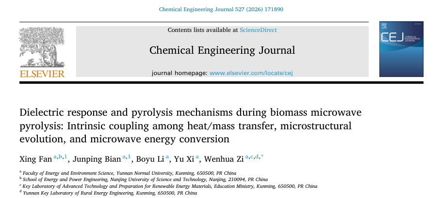 近期,云南师范大学能源与环境科学学院资文华教授团队在国际知名期刊《Chemical Engineering Journal》(IF = 13.2)发表题为“Dielectric response and pyrolysis mechanisms during biomass microwave pyrolysis: Intrinsic coupling among heat/mass transfer, microstructural evolution, and microwave energy conversion”最新研究成果。论文链接:https://doi.org/10.1016/j.cej.2025.171890,云南师范大学为第一完成单位,通讯作者为资文华教授。该成果以烟草废弃烟梗为对象,系统阐释了烟梗微波热解关键参数对生物炭微观结构影响规律,通过2D-FTIR-COS技术阐明生物炭表面官能团响应顺序为: O–H→C=O→C–O–C→C–H→芳香C=C,并利用THz‑TDS光谱和 Debye弛豫模型对产物微波介电参数预测,发现物料初始含水量为 20%时可显著提升微波吸收和加热性能,揭示了生物质微波热解介电响应机制主要依赖偶极极化、离子极化及界面极化的协同响应,这为介电参数表征和生物质微波热解提供了新视角。