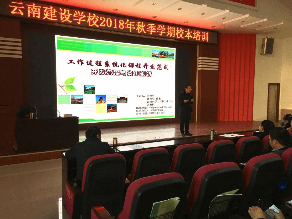 本次培训的专家团队无由国内知名的职教专家组成,建设学校领导班子认为是一次高规格、高层次的培训。无锡机电高等职业技术学校党委副书记、副校长贾厚林教授:新时代职业学校的品质治理;昆明市官渡区职业高级中学路小军校长:职业院校教学能力大赛与教师教学能力、做温暖人心的教育;云南师范大学王俊程教授:教师队伍高效工作法与执行力提升;天津中德应用技术大学闫智勇博士后:工作过程导系统化课程开发范式及开发流程与案例剖析;昆明理工大学建筑与城市规划学院副院长杨大禹教授:民族建筑;北京师范大学教育学部尹力教授:网络背景下依法执教相关问题探讨等专题讲座,紧紧结合学校教师队伍建设与专业发展的实际需要,信息丰富、理念新颖、观点前沿、贴合时代要求,讲授极富吸引力,最后在全校教师集体参与的团队素质拓展训练活动中结束。