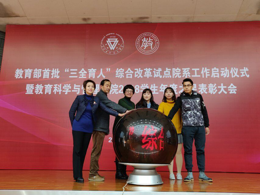 教育科学与管理学院党委书记张云宣布教育部首批“三全育人”综合改革试点院系工作正式启动,并与院长李天凤、项目负责人刘虹、教师代表张睦楚、学生会主席赵娜、研究生会主席张龙共同点亮了教育部首批“三全育人”综合改革试点工作启动球。
