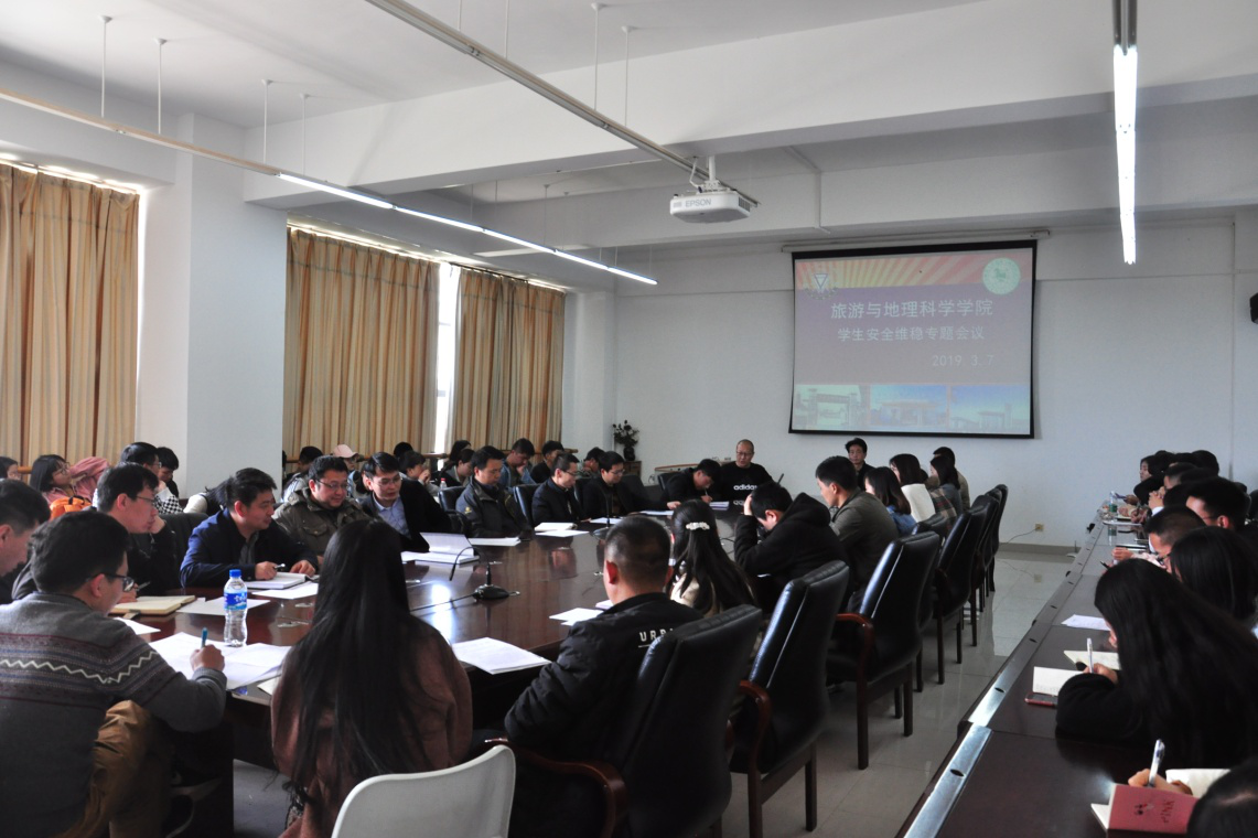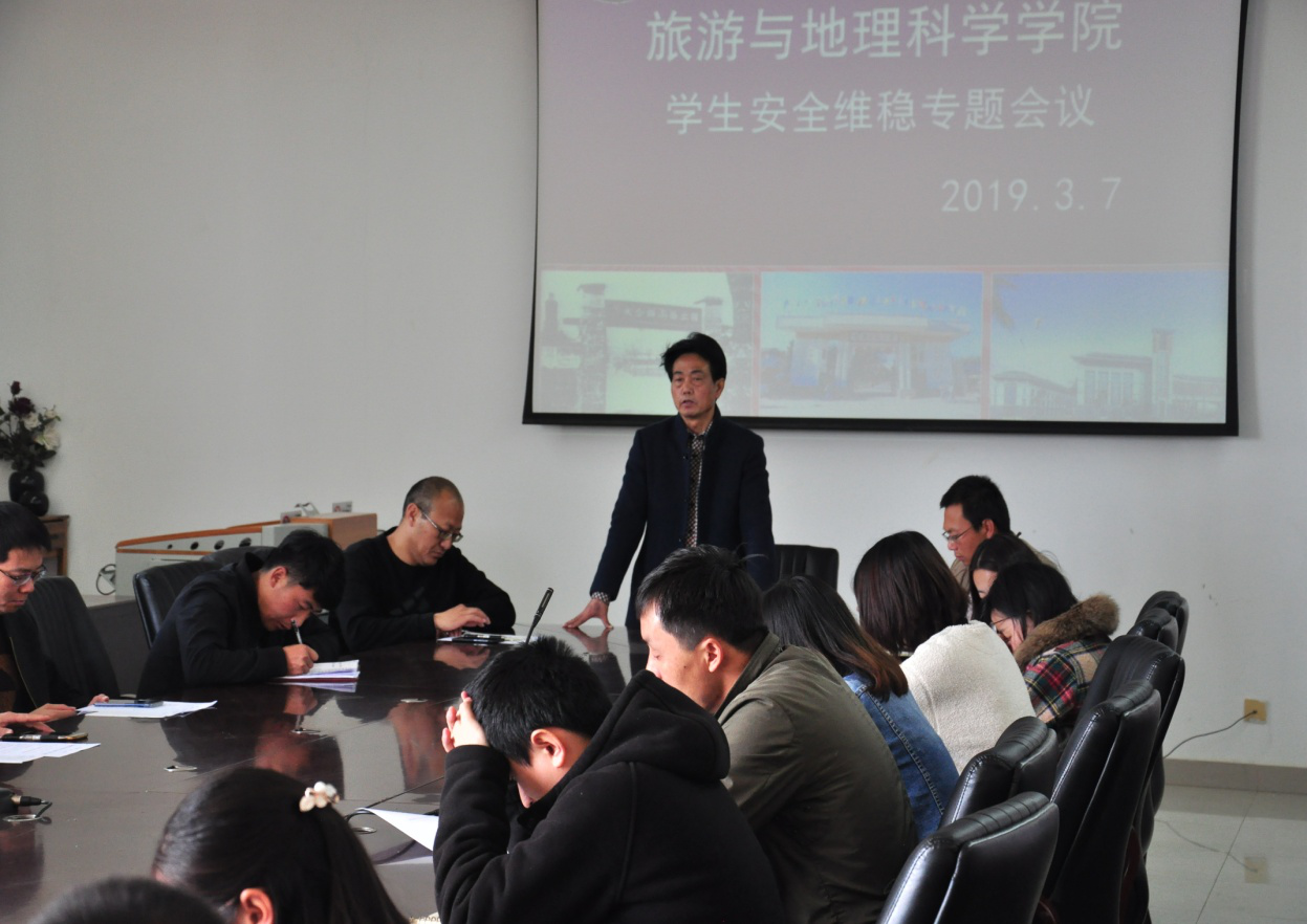 3月7日,旅游与地理科学学院在睿智5号楼308会议室召开了学生安全维稳专题会议。学院党委书记张天明老师,学院辅导员、班主任以及各班班长、团支书共计97人参加了本次会议。会议由学院党委副书记白宇老师主持。