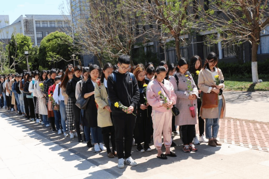 2019年4月4日下午,清明节前夕,外国语学院组织全体学生党员在明德2幢广场纪念碑前举行献花仪式,缅怀维和英雄和志虹。