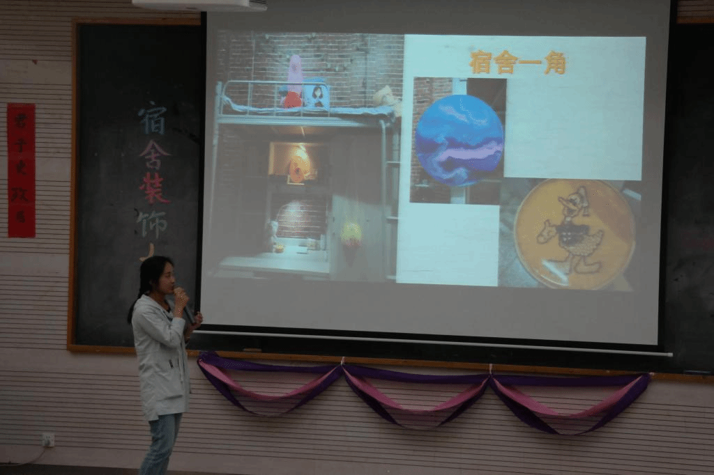 进入决赛的宿舍准备充分、幽默风趣的讲解一次次把赛场的气氛点燃,精彩纷呈。大家主题各异,有名为“小确幸”、“独家记忆”等宿舍的温馨婉约;也有名为“星馨屋”的简约爽朗以及名为“隰有荷”的古朴典雅。“芳华岁月”宿舍以一曲《棠梨煎雪》拉开了讲解的序幕,他们或是生活中遇到的困难,亦或是宿舍聚餐的温馨,还是比赛获奖的欢乐,都让我们认识到了一个团结、温馨、积极向上的6栋361。“北纬贰贰柒”宿舍的讲解幽默大气,结合视频和PPT展示,通过宿舍的成员简介、宿舍生活的照片、宿舍学习成果等方面的展示,很好的诠释了温暖、阳光、积极、乐观的宿舍文化。