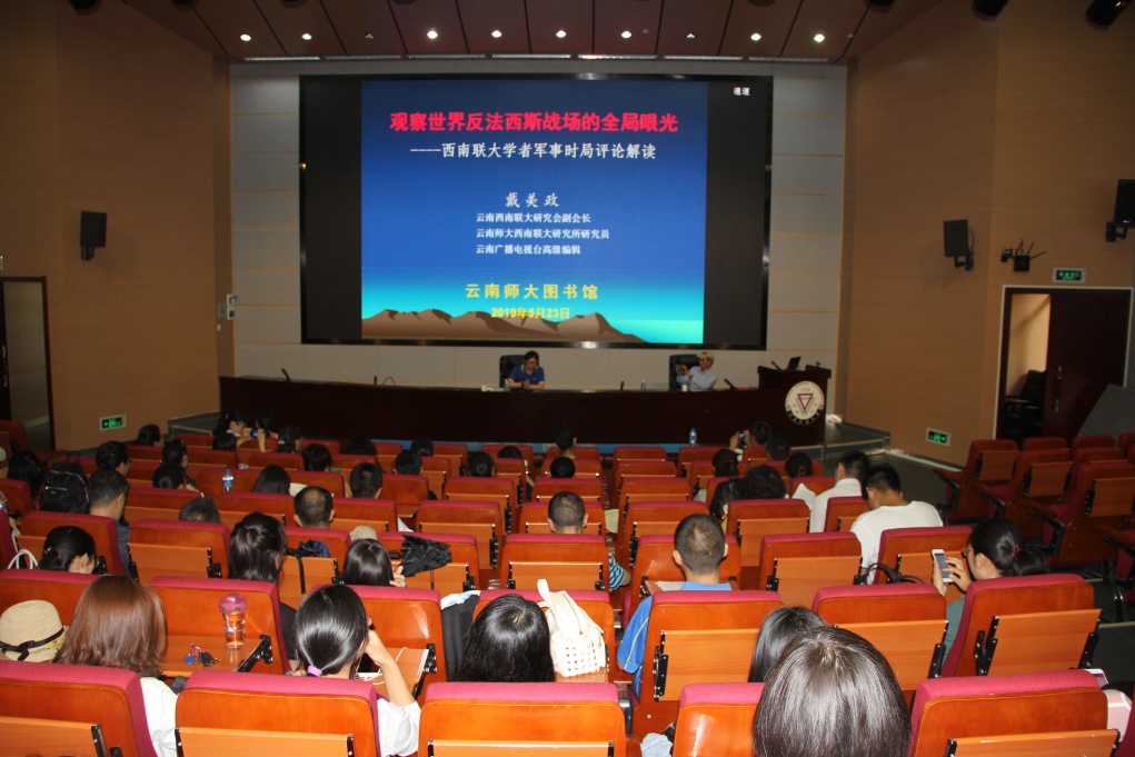 作为第七届校园文化月系列活动之一,523日下午,图书馆在西边中心报告厅举办了“湖畔讲坛”信息素养系列2019年第9讲,特邀云南西南联大研究会副会长、云南师大西南联大研究所特聘研究员戴美政担任讲坛嘉宾,为到场的百余位师生作了题为“观察世界反法西斯战场的全局眼光——战时西南联大学者军事时局评论解读”的专题讲座。讲座由图书馆副馆长傅宇斌主持。