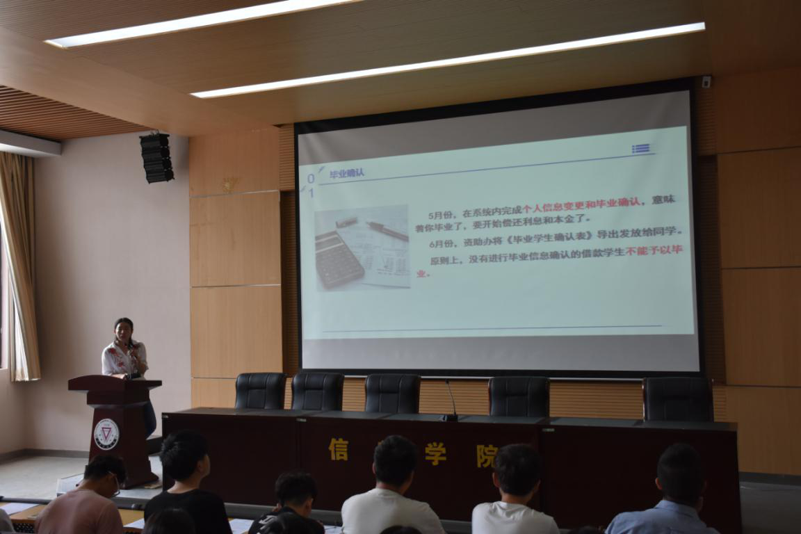 辅导员刘萌老师毕业生详细介绍了国家开发银行、中国银行生源地助学贷款的还款政策和注意事项,并用学生的实际案例向毕业生讲解了按时还款的重要性,提醒毕业生要诚信还款否则将影响个人征信职业发展个人生活。另外,刘萌老师还介绍了团组织关系转接办理的要求和程序