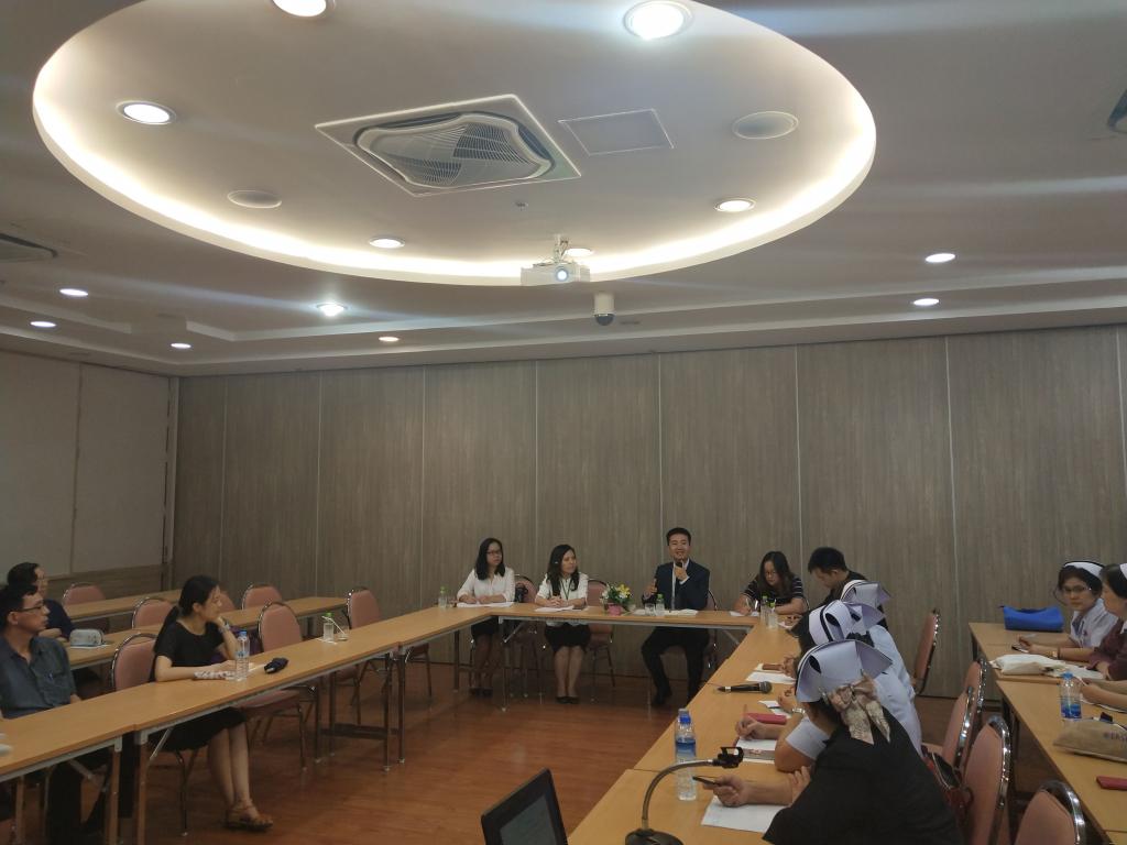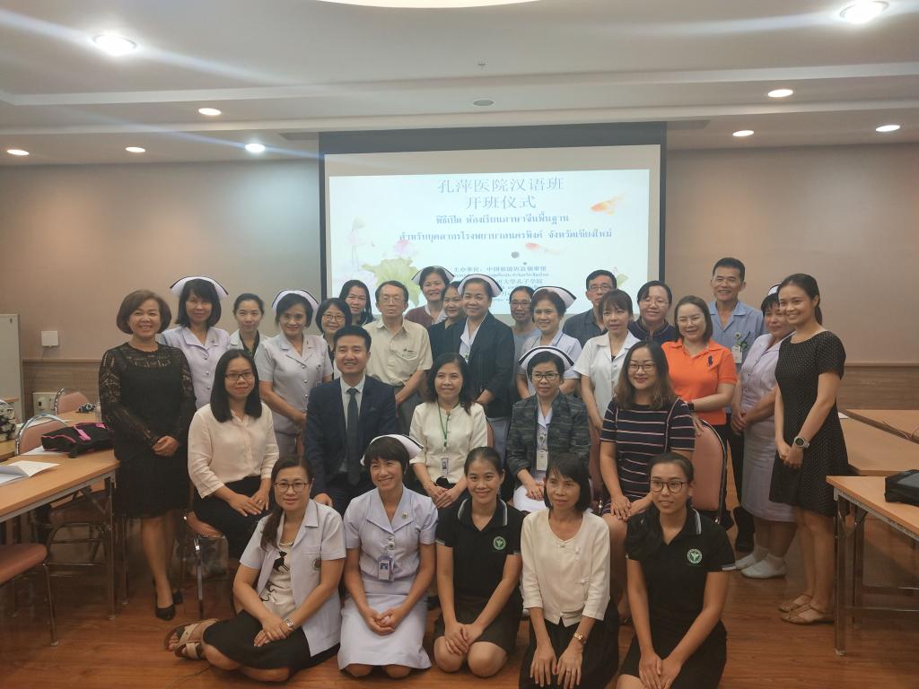 6月5日下午,由中国驻清迈总领馆主办,清迈大学孔子学院承办的清迈纳空萍医院汉语培训班顺利开班。中国驻清迈总领馆马振东领事、纳空萍医院人事部部长瓦鲁妮(Mrs.Varunee maneerat )女士、清迈大学孔子学院教师及医院20余名医护人员参加了本次开班仪式。