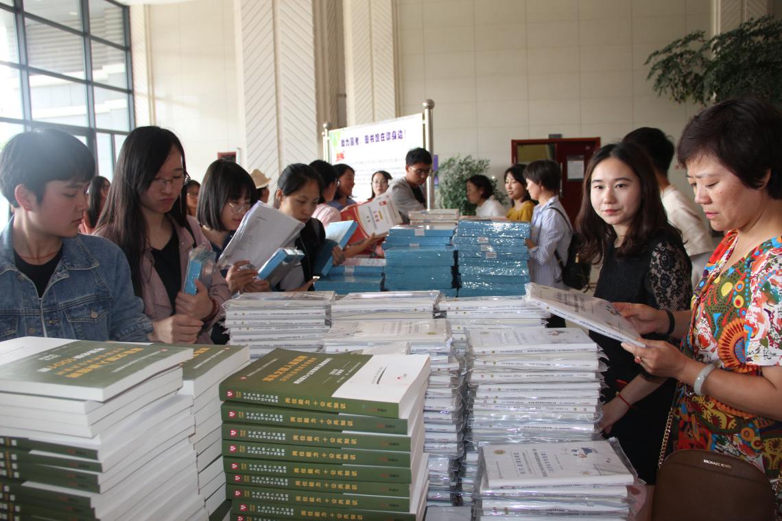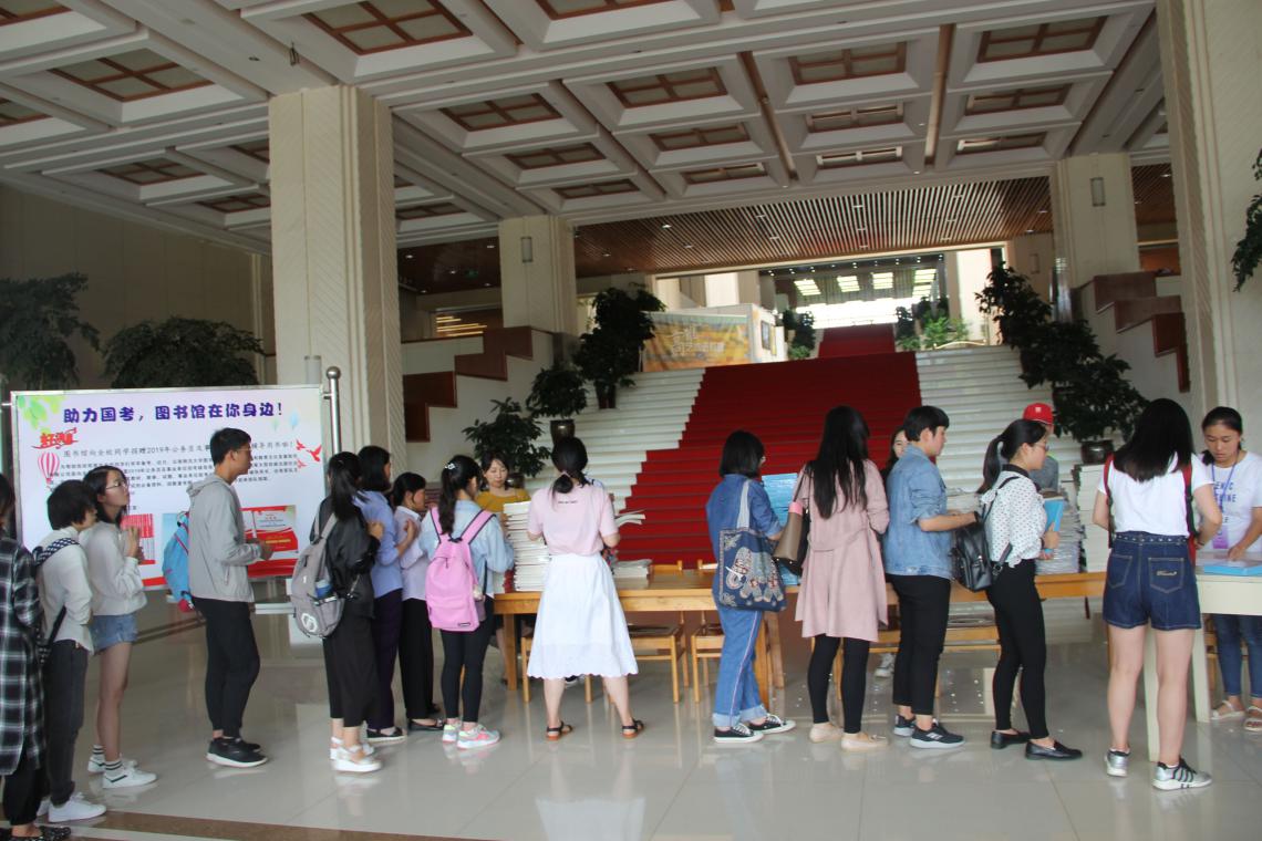 下午三点,赠书活动开始。图书馆一楼大厅人头攒动而井然有序,同学们早早来到赠书现场排队领取自己所需要的复习资料。不到一个小时,全部赠书分发完毕。图书馆还准备了20套完整的复习用书存放在图书馆三楼“爱心接力站”,供同学们阅览。