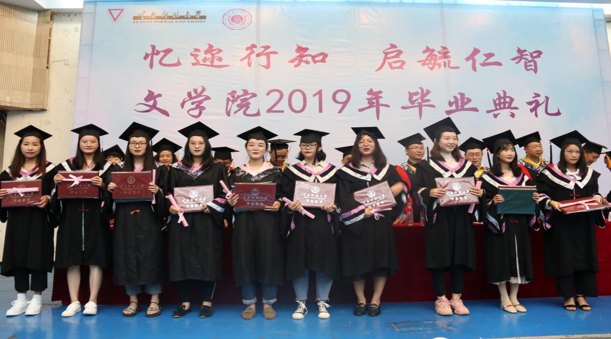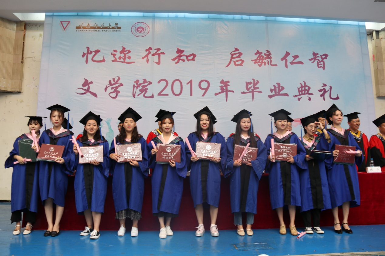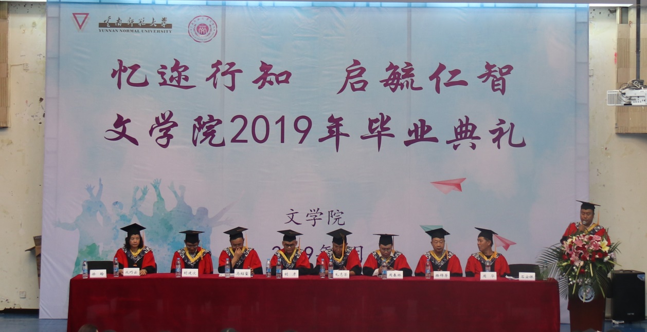毕业典礼在庄严肃穆的国歌声中拉开了序幕。周春林副院长宣布了文学院2019届本科毕业生毕业情况和学位获得情况;马绍玺副院长宣布了文学院2019届硕士研究生毕业情况和学位获得情况。毛志荣书记宣读了《云南师范大学关于表彰2019年省级优秀毕业生的决定》《云南师范大学关于表彰2019年校级优秀毕业生的决定》《云南师范大学关于表彰2019年毕业生服务基层志愿者的决定》《云南师范大学关于表彰2019年自愿赴边疆艰苦行业就业先进毕业生的决定》,并代表全院师生对顺利完成学业的2019届毕业生表示热烈祝贺,向关心学院发展、支持学生顺利完成学业的家长、老师们表示亲切慰问和崇高敬意。
