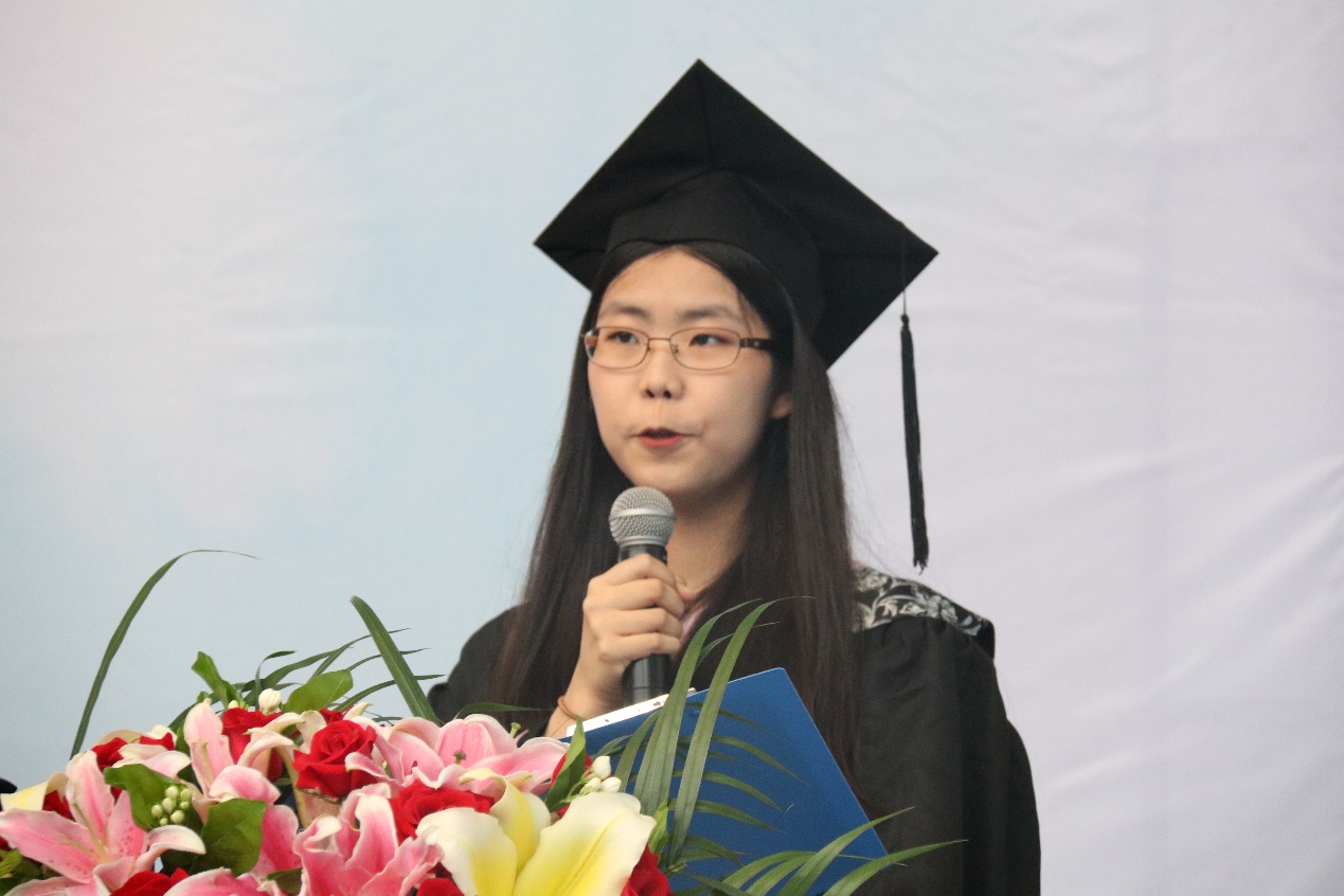 毕业生代表张闻昕在发言中回顾了自己四年来的学习生活,深切表达了对良师益友及对父母的感激之情,希望同学们都能坚守自己的梦想,并一直努力奋斗着。在校生代表牟婕发言,表达了对毕业的学长学姐们的感谢,向他们送上了诚挚祝福。