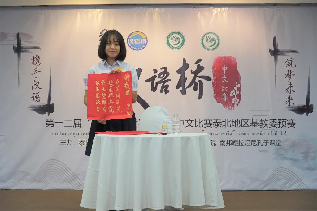 下午进行的才艺表演中,多才多艺的泰国中学生身着各色中国传统服装,表演了舞蹈、葫芦丝、武术、中国歌曲、舞狮、茶艺、书法、剪纸等等,来自清莱中学的学生表演了一套完整的功夫茶茶道,虽然手法略显生涩,但过程流畅完整。值得一提的是,有三位选手展示了书法,写了“千里共婵娟”、“春临大地花开早”、“静夜思”全诗,运笔手法娴熟,展现出了较扎实的基本功。