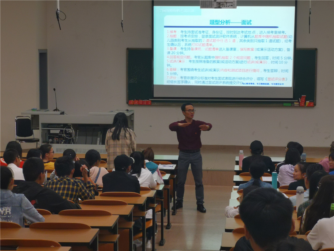 最后,杨老师从教师资格面试流程、题型、攻略、技巧等方面给在场同学们进行细致入微的推敲。全程讲座过程中同学们积极踊跃、全神贯注,讲座现场气氛良好,得到广大同学们的热烈欢迎及普遍认可。