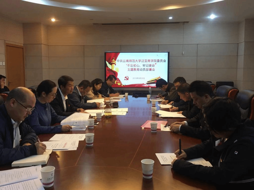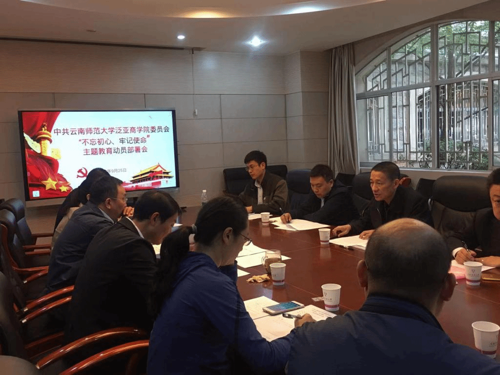 根据中共云南师范大学党委开展“不忘初心、牢记使命”主题教育的工作部署和要求,在校党委主题教育第十一指导组的指导下,泛亚商学院于9月25日上午在学院109会议室召开了“不忘初心、牢记使命”主题教育动员部署会。校党委“不忘初心、牢记使命”主题教育第十一指导组全体成员、学院全体党委委员、全体党支部书记、教职工党员代表以及学生党员代表参加了会议。会议由学院党委书记陈玉林主持。