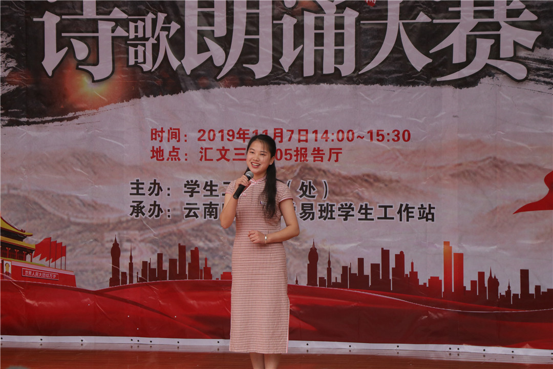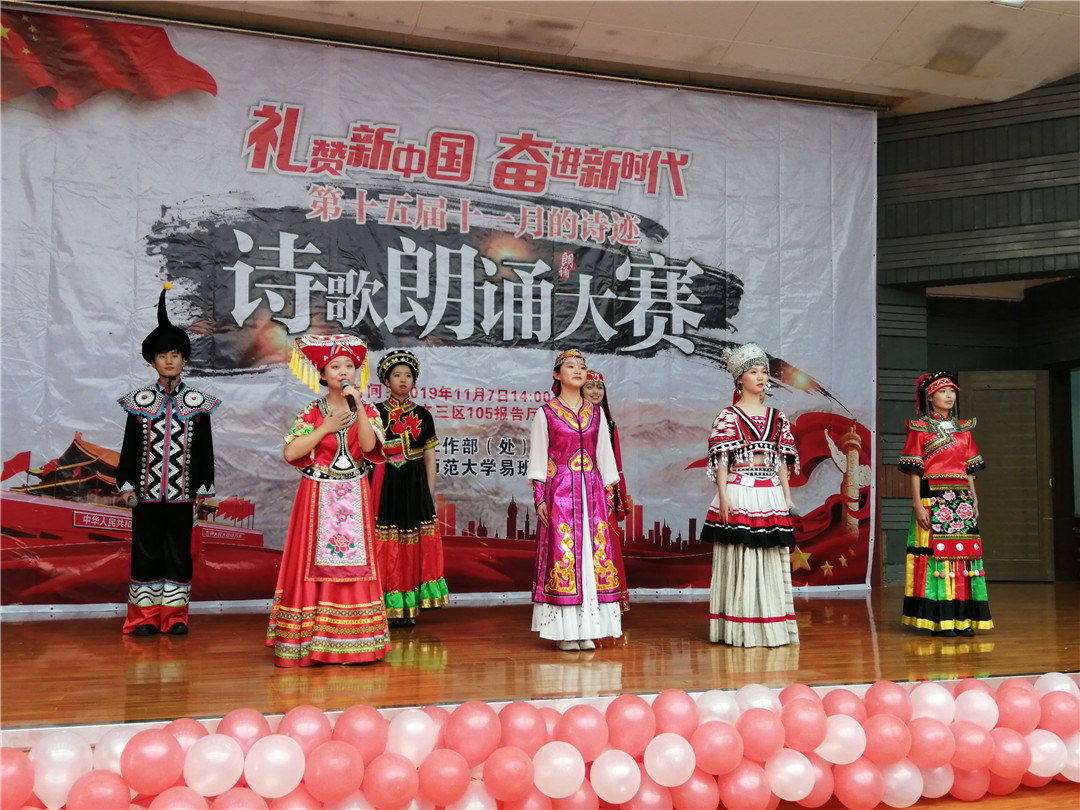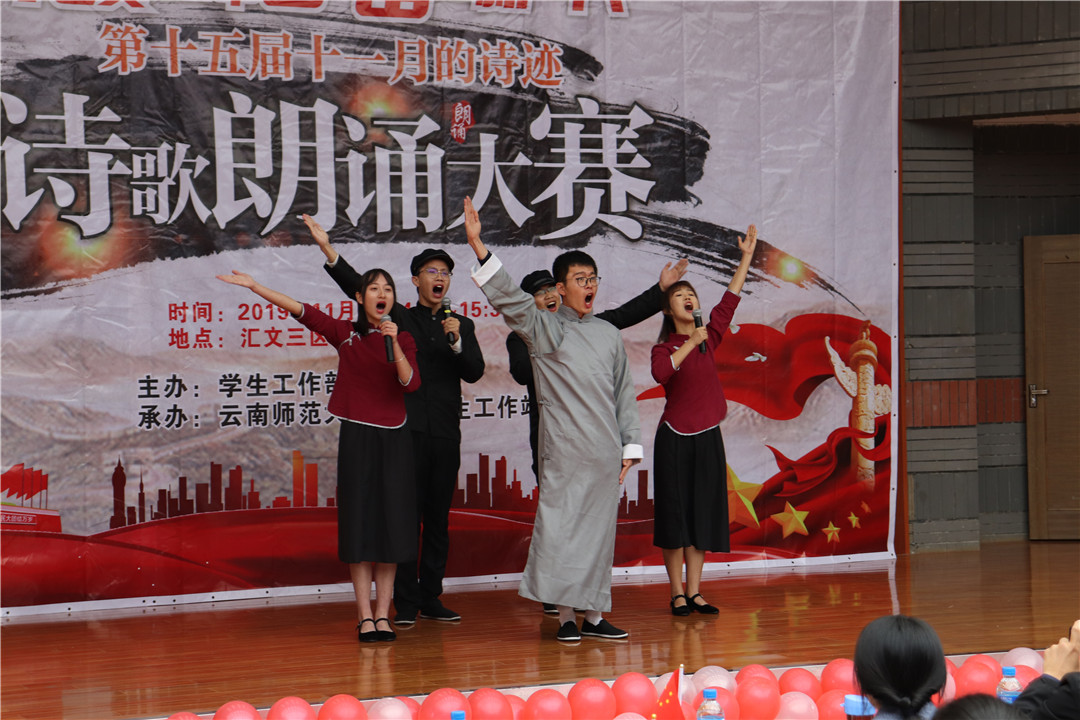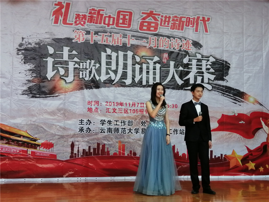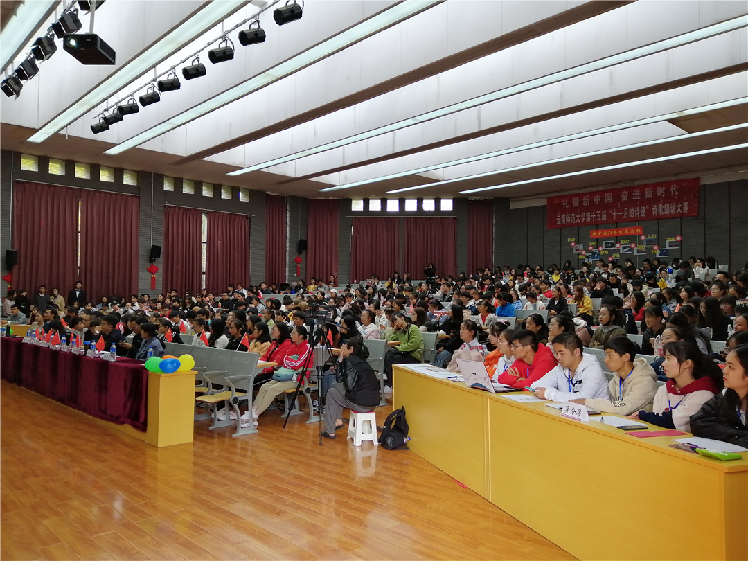 11月7日,云南师范大学“礼赞新中国 奋进新时代”暨第十五届“十一月的诗迹”诗歌朗诵大赛决赛在汇文楼三区105报告厅举行,比赛由云南师范大学学生工作部(处)主办,云南师范大学易班学生工作站承办。校团委书记刘莹老师,传媒学院谭辉老师、路琦老师,校党委宣传部曹威老师、研究生工作部赵彪老师、学生工作部(处)李茜老师、对外合作办蒋晓涵老师担任本次本次比赛的评委。各学院500余名师生观看了比赛。