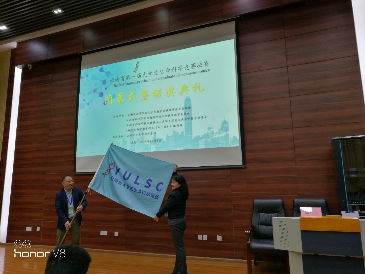颁奖典礼最后,我校生命科学学院院长范丽仙接过云南省大学生生命科学竞赛赛旗,下一届云南省大学生生命科学竞赛将在我校举行。(生命科学学院 供稿)