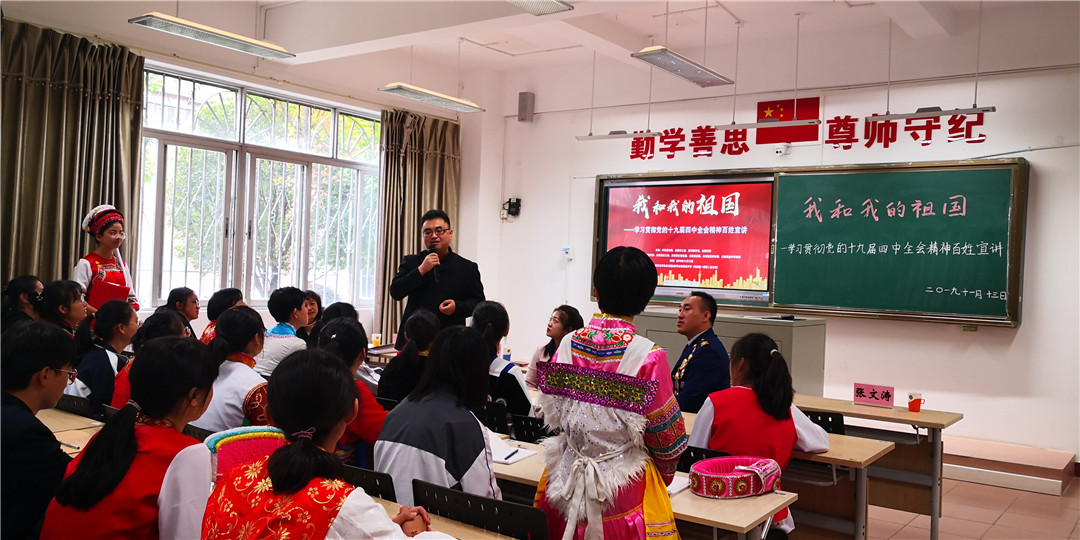 在全国上下隆重庆祝中华人民共和国成立70周年、深入学习宣传贯彻党的十九届四中全会精神之际,由中央宣传部、全国总工会、共青团中央、全国妇联联合主办,中共云南省委宣传部、云南省总工会、共青团云南省委、云南省妇联、云南民族中学承办的“‘我和我的祖国’----学习贯彻党的十九届四中全会精神”百姓宣讲全国宣讲报告会于2019年11月13日在云南民族中学举行。