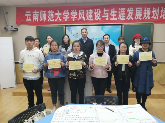第二阶段培训于11月14日下午开展,夏磊老师进行了职业决策与行动计划等方面的课程培训。他阐述了职业生涯决策中的重要选择、大学生常见的职业决策问题、决策过程中的阻碍等内容,并对学生进行个别辅导、指导学生撰写生涯规划书。随后活动负责人夏慧组织全体学员分为10个小组团结协作绘制一位成员的职业规划海报,让学员更加直观地感受职业生涯规划的步骤和方法,随后小组成员上台展示,并投票选出优秀作品。