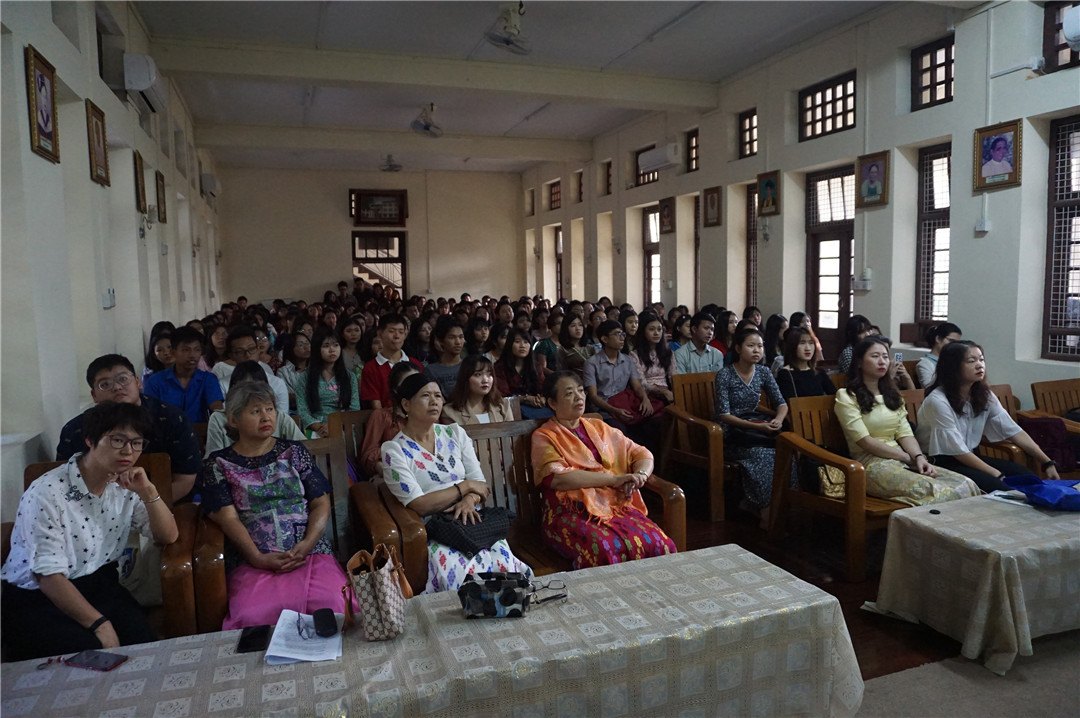 仰光大学缅语系Dr. NYEIN NYEIN 教授、汉语班负责老师DAW KHIN MAR SWE、缅语系部分老师和东方孔子课堂的5位授课老师、近200位学员共同参加了开班典礼,现场座无虚席,学员们热情高涨。这是东方孔子课堂连续第五年在仰光大学开设汉语班,也是五年来汉语班学员人数最多的一年。