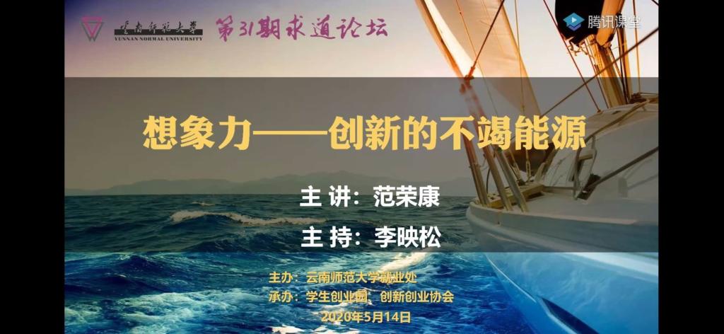 为认真贯彻落实学校疫情防控期间“停课不停教、不停学”的工作要求,由云南师范大学就业处主办,学生创业园、创新创业协会承办的第三十一期求道论坛于514日下午在腾讯课堂线上直播平台顺利进行,我校各学院(部)2500余名同学积极报名参加了线上讲座。