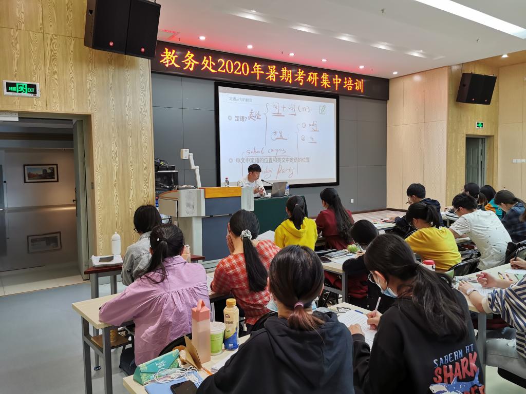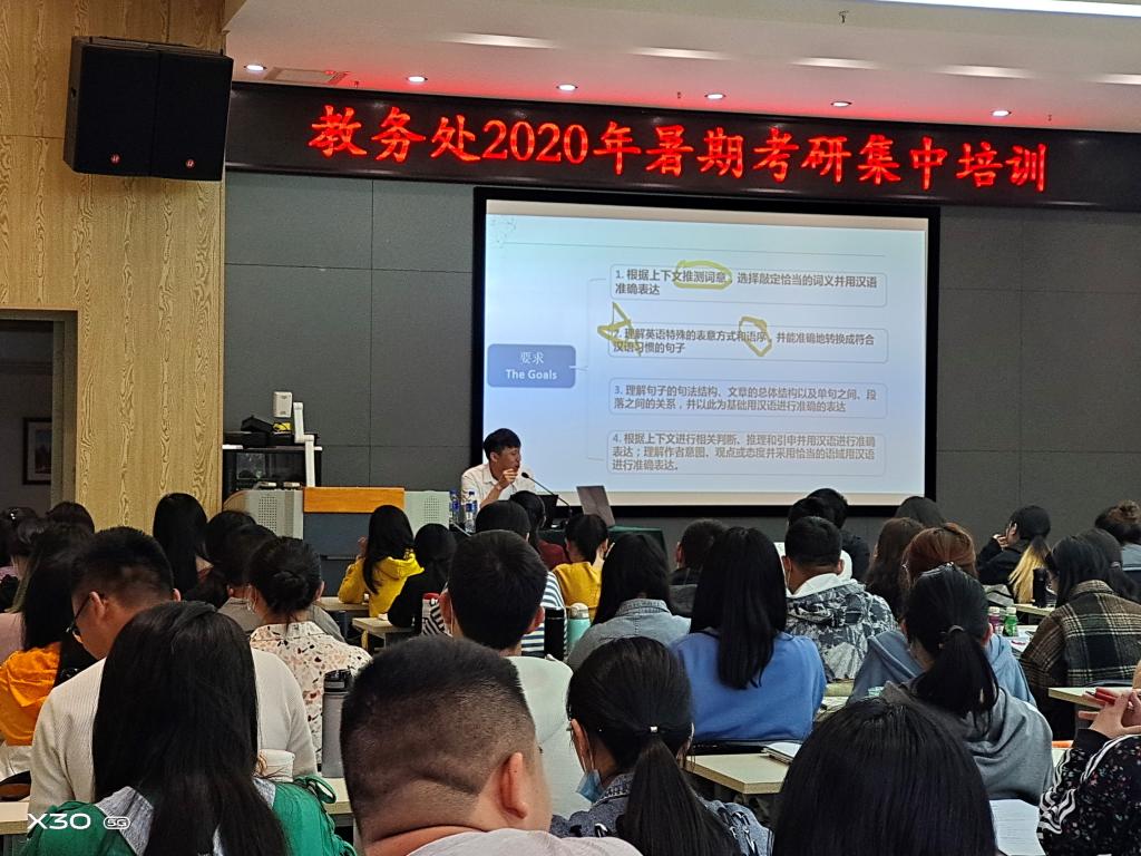 7月22日上午9点,培训正式开始。此次培训设政治精讲、英语阅读、英语写作、英语完形填空和翻译四个培训主题,每个主题培训2-7天不等。教务处聘请的四位考研培训名师针对四个培训主题,紧扣考纲,深入浅出,强调方法引导和思维训练,注重活跃课堂氛围,整个培训过程专业且精彩。为保证培训效果,教务处还专门配备培训班主任,以维护培训秩序,开展每日督学,落实防疫举措。
