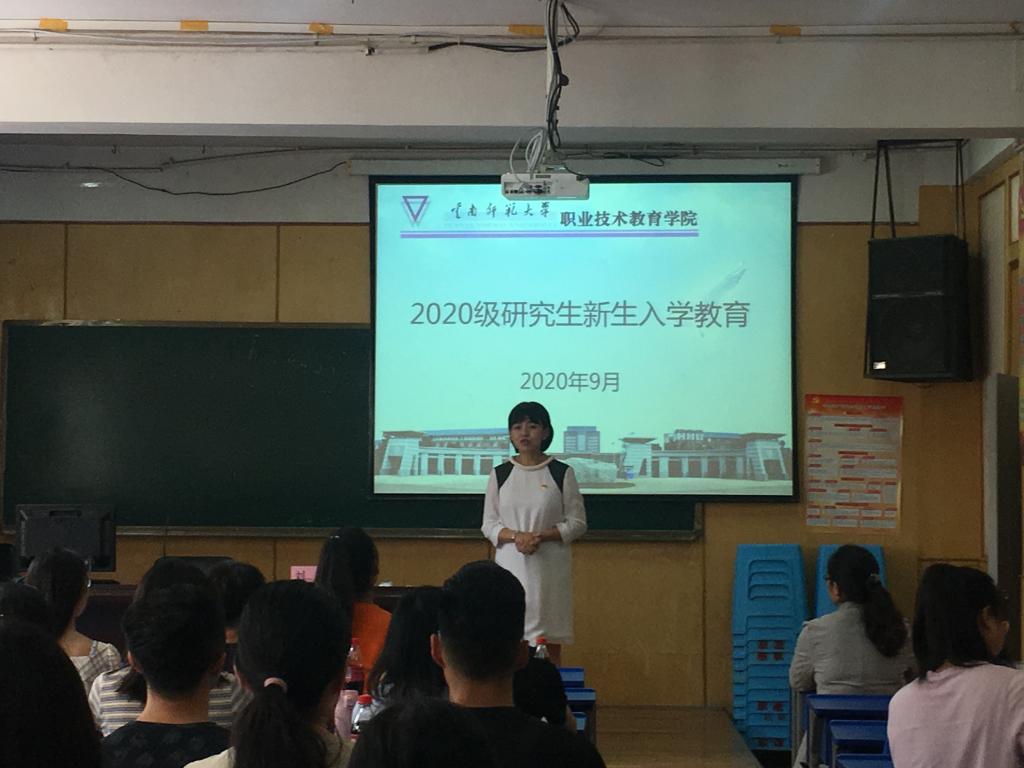 9月4日下午,职业技术教育学院在明析楼225教室举行2020级研究生新生入学教育大会。学校研究生院和研究生部(处)老师以及疫情防控专家分别为研究生新生进行专题教育。职业技术教育学院党委书记刘虹、副书记向斯楠、研究生辅导员左文君和全体研究生新生参加了此次入学教育。