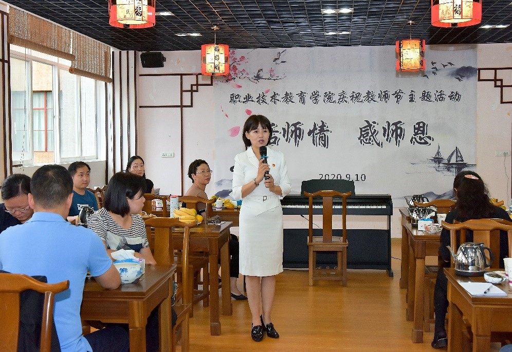 职业技术教育学院党委书记刘虹向学院全体教职工送上教师节的祝福,并号召教职工们学习习近平总书记关于教育的重要论述和系列讲话精神,不忘立德树人初心,牢记为党育人为国育才使命,在新时代的教育战线上不断作出新的贡献。