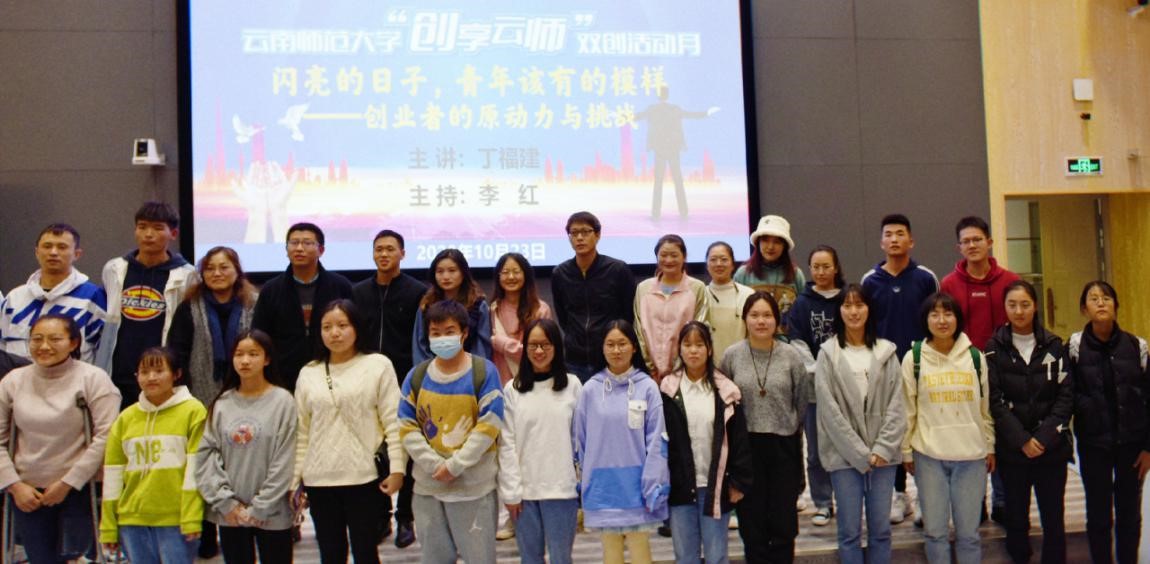 1023日晚,云师讲坛第十二讲在云南师范大学呈贡校区教师教育国家级实验教学示范中心214报告厅举行。本次讲座主题为“闪亮的日子,青年该有的模样——创业者的原动力与挑战”,由金学教育创始人兼董事长、我校2017届行政管理专业毕业校友丁福建开讲。丁福建是全国第三届“闪亮的日子——青春该有的模样”大学生创业人物、全国践行社会主义核心价值观先进个人、全国学联二十六大云南唯一特邀代表、中国第十届大学生年度人物、云南省向上向善好青年提名奖获得者、云南鲁甸“8·03”地震救灾志愿者。本次讲座也是云南师范大学“创享云师”双创活动月系列活动之一,由云南师范大学就业处处长兼创新创业学院办公室主任李红老师主持。