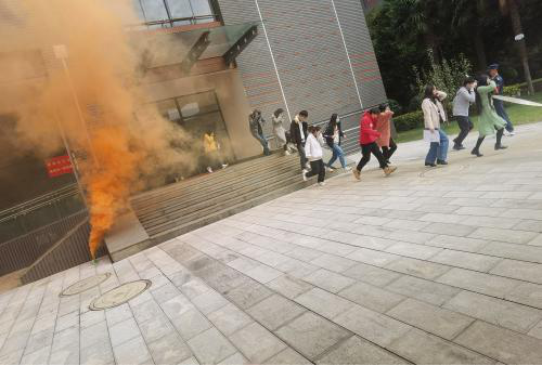 消防安全培训讲座结束后,师生回到各自所在实验室,按照预定计划准备演练开始。演练总指挥保卫处胡兆海处长下达“开始演练”的指令后,实验室浓烟四起并伴随尖锐而又急促的火警警报声,实验室安全监督员发现火情后立即拨打火警电话,同时模拟师生在疏散引导组的指挥下,迅速排好队,从各实验室按预案规定的5条线路有序撤离到外安全地点。