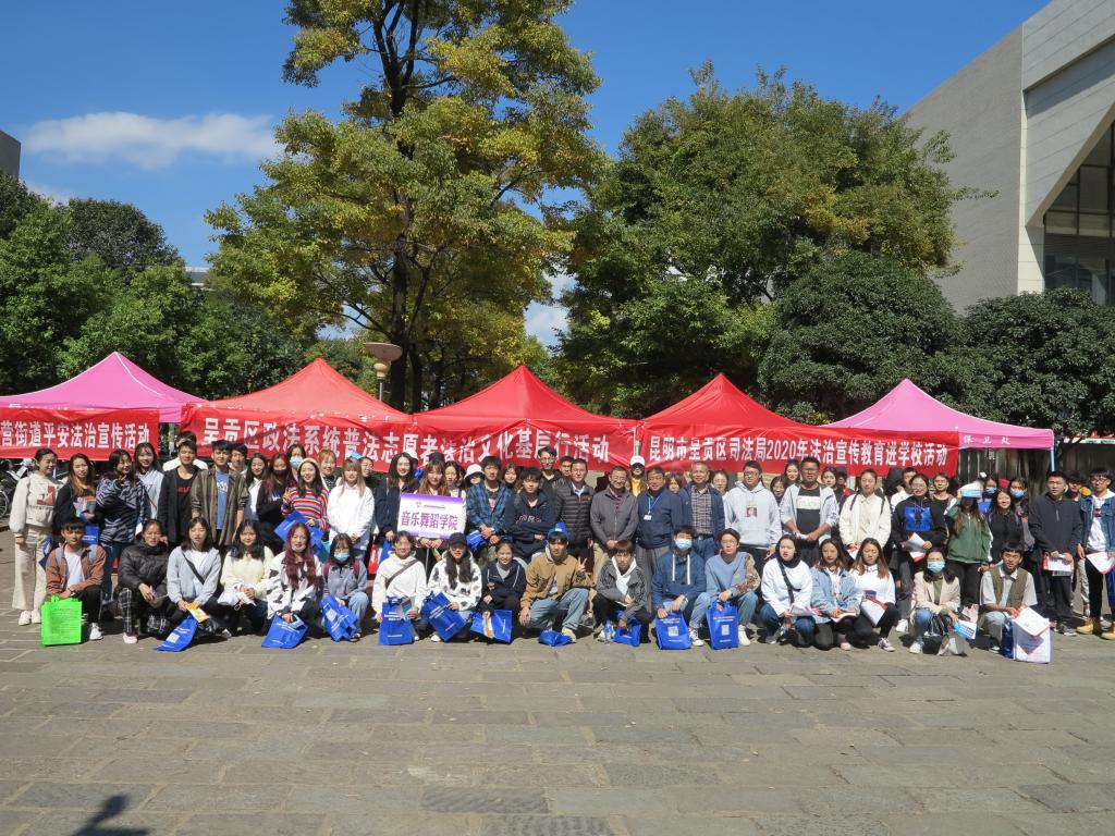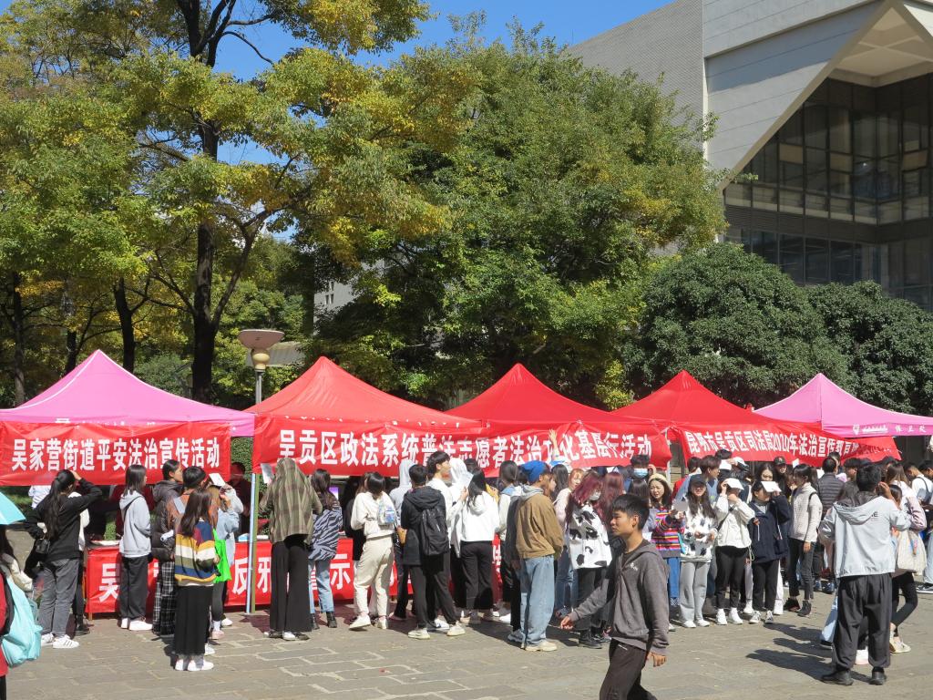为提高校师生整体法治意识和安全意识,引导广大师生员工自觉遵法学法守法用法,共同营造安全有序、和谐稳定的校园法治环境,11月6日上午,学校保卫处联合呈贡区委政法委、区法院、区检察院、市公安局呈贡分局、区司法局、团区委、吴家营街道办事处7家单位在呈贡主校区开展法治安全集中宣传活动呈贡区委政法委副书记王远昆、吴家营街道办事处综治办主任赵果良、保卫处胡兆海处长汪飞奇副处长全程参加此次活动