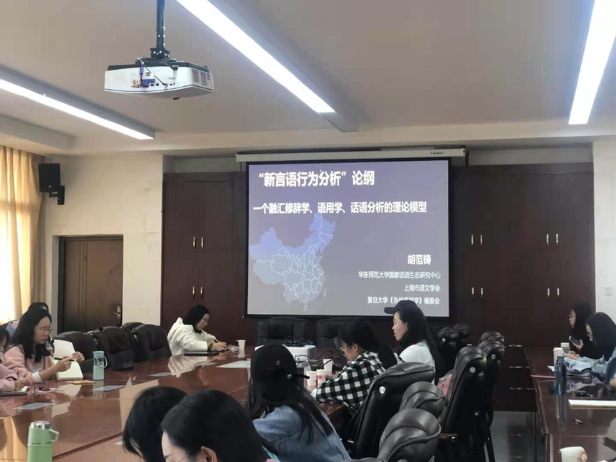 1113日上午,华东师范大学二级教授、华东师范大学话语研究中心首席专家、上海市语文学会会长、复旦大学《当代修辞学》(CSSCI专业性期刊)编委会主任胡范铸教授应文学院邀请做客“一多中文讲坛”第59期,在明德3号楼会议室进行了题为“新言语行为分析:一个融合修辞学、语言学、话语分析的理论框架”的专题讲座,讲座由文学院副院长余金枝教授主持