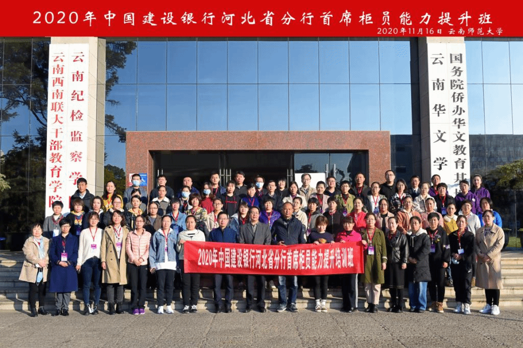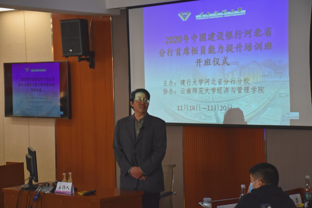 11月16日,由中国建设银行河北省分行、建行大学河北省分行分校主办、云南师范大学经济与管理学院协办2020年中国建设银行河北省分行首席柜员能力提升培训班在我校开班。经济与管理学院联系领导李国疆学院党委书记华致雄、院长张广斌、党委副书记赵显辉出席了开班仪式。仪式由学院副院长常志有主持。