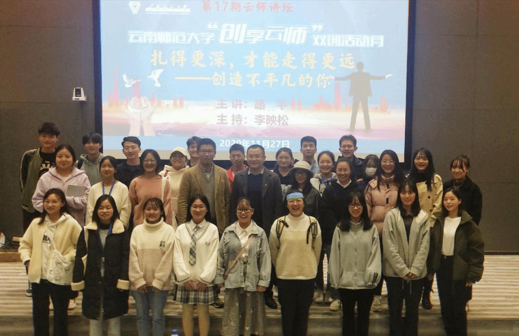 11月27日晚,云师讲坛第十七讲我校呈贡校区教师教育国家级实验教学示范中心214报告厅如期举行。本期讲坛特邀中诺教育集团党委书记、优秀校友路平为主讲嘉宾为同学们带来主题“扎得更深,才能走得更远——创造不平凡的你”的讲座。本次讲座也是云南师范大学“创享云师”双创活动月系列活动之一,讲座由创新创业学院办公室主任李映松老师主持。我校各学院(学部)200余名同学参加了此次讲座。