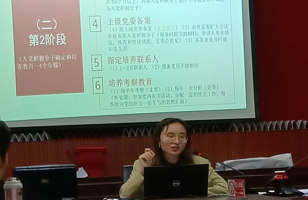 第六讲由历史与行政学院专职组织员周媛进行了“发展党员程序要求及相关表格填写规范”的专题辅导,针对党员发展的五个阶段和25个步骤为大家作了详细解读,并对支部文件的保存、党员发展程序以及云岭先锋使用等等提出了规范化要求,强调必须把政治标准放在发展党员的首位。