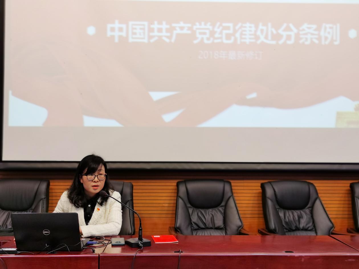 教育学部党委副书记朱静虹同志以“严守党的政治纪律和政治规矩”为主题,带领大家学习《中国共产党纪律处分条例》。她从《中国共产党纪律处分条例》颁布实施的背景和意义入手,解读了《中国共产党纪律处分条例》修订后的八个特点,对政治纪律、组织纪律、廉洁纪律、群众纪律、工作纪律、生活纪律逐一进行解读,并结合大学生实际强调了如何遵守党的政治纪律和政治规矩。