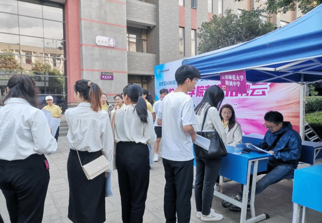 五月的昆明早晨微凉,但来参加招聘会的同学络绎不绝,现场气氛热烈。据悉,参加本次招聘会的单位有云南师范大学附属中学、云南师范大学实验中学、建水实验中学、云南农业大学附属中学、云南师范大学附属中学第二中学、昆明市盘龙区汇承中学、云南经济管理学院附属高级中学等50余家,涵盖教育、金融、信息技术与互联网等行业领域,岗位种类繁多,共提供3000余岗位,签约率达到10%。