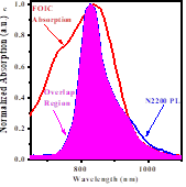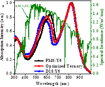 图2.三元薄膜的吸收光谱和太阳光光谱(a);混合给体材料的载流子传输(b)和混合受体材料的二次能量转移(c)。